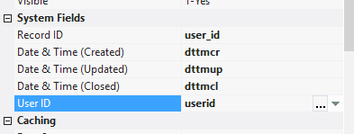 2.5.3.3. In system fields Record ID, Date & Time (Created), Date & Time (Updated), Date & Time (Closed), User ID choose fields from the table - user_id, dttmcr, dttmup, dttmcl, userid;