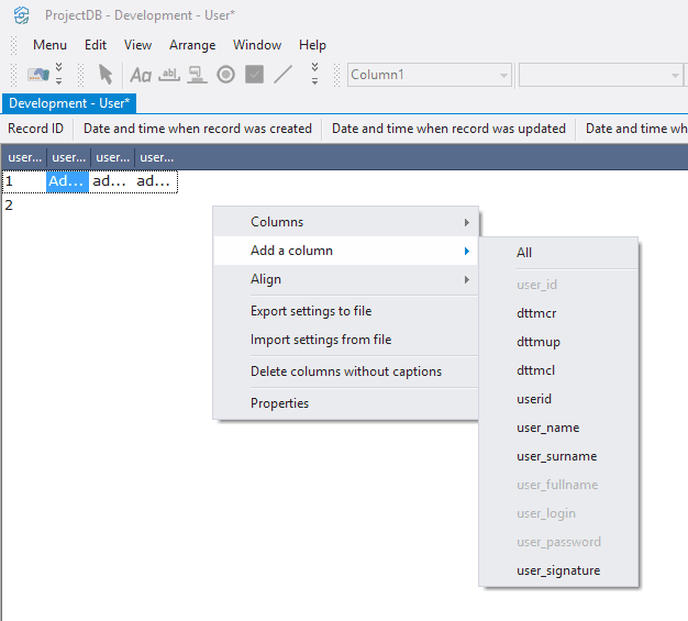 2.5.2.5. Open the context menu by right-clicking in the empty space of the object, choose Add a column and select columns user_id, user_fullname, user_login, user_password;