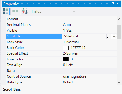 2.5.3.29. Select the field user_signature - this field will occupy the remaining space of the form and store multiple text lines, so scrolling of the text vertically should be allowed, specifying value 2-Vertical in the field Scroll Bars;