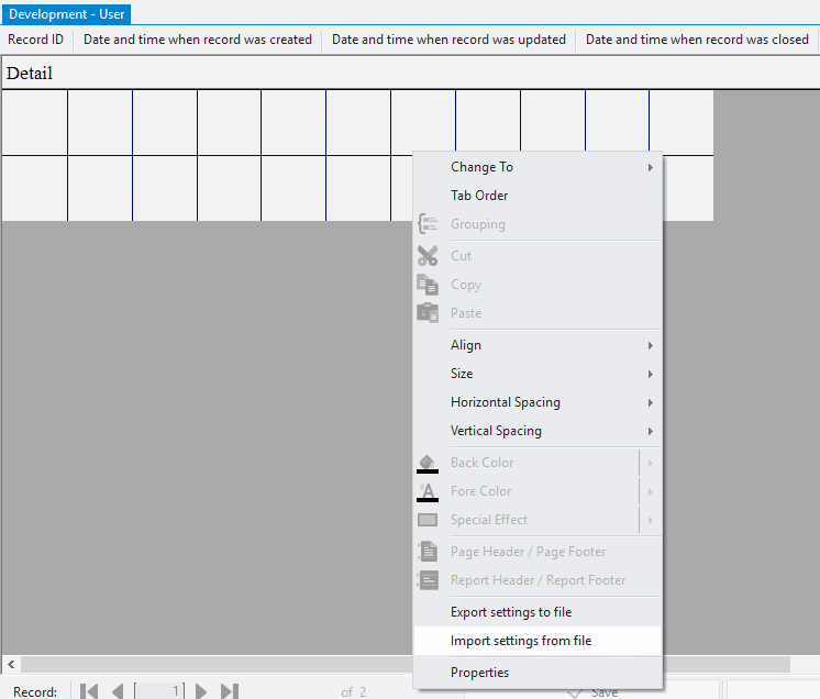 2.5.2.4. In system fields Record ID (a unique record ID), Date & Time (Created) (date and time when record was created), Date & Time (Updated) (date and time when record was updated), Date & Time (Closed) (date and time when record was closed), User ID (ID of the user who created the record), select accordingly fields user_id, dttmcr, dttmup, dttmcl, userid;