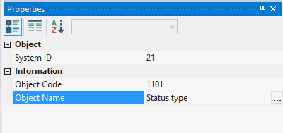 4.3.1.3. In the window Properties in the field Object Code type in 1101, in the field Object Name type in Status type;