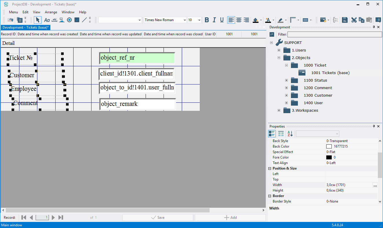 5.2.1.9. In the Properties window, enter 1001 in the Object Code field, enter Tickets (base) in the Object Name field.