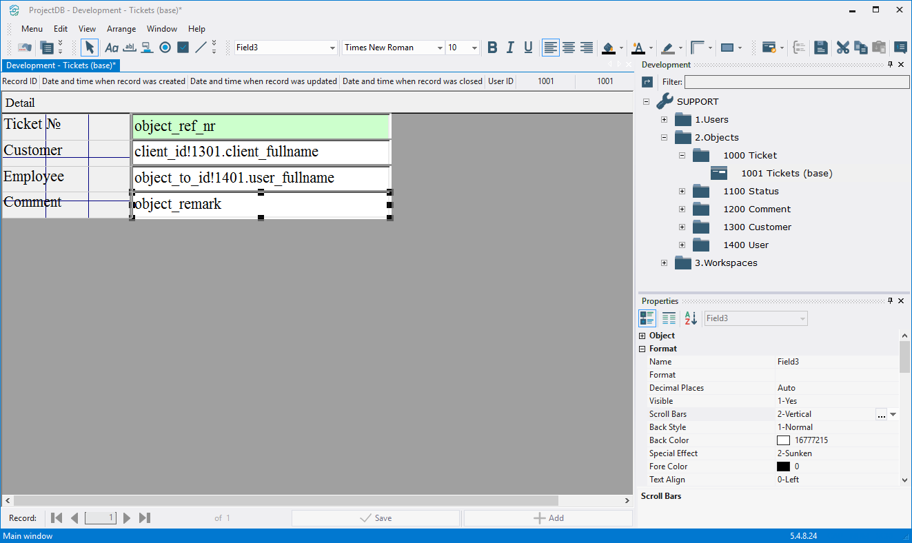 5.2.3.38. Select the field object_remark - this field will occupy the remaining free space when working in the form and store multi-line text, so you should allow the text to scroll vertically by setting the Scroll Bars field to 2-Vertical