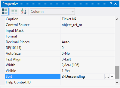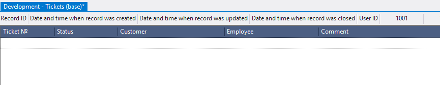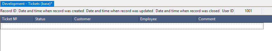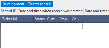 5.2.2.5. Select each column by clicking the left mouse button on any line of the table, specify in the field Caption the displayed name of the column - Ticket №, Status, Customer, Employee, Comment, respectively;