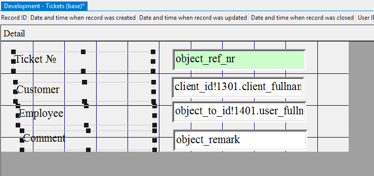 5.2.3.3. In system fields Record ID, Date & Time (Created), Date & Time (Updated), Date & Time (Closed), User ID choose fields from the table - client_id, dttmcr, dttmup, dttmcl, userid;
