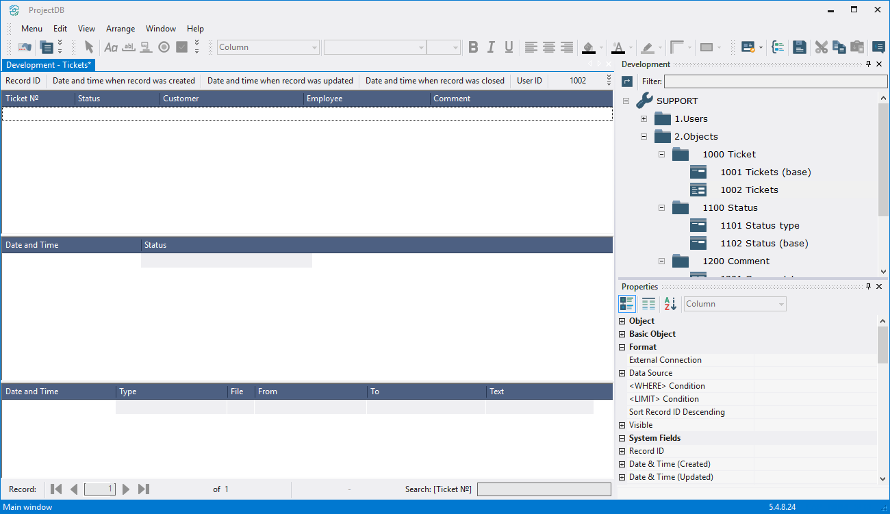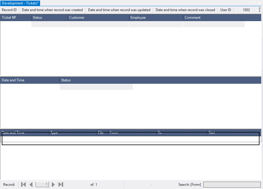 The main object to work with tickets is 1002 Tickets, that consists of the tables 1001 Tickets (base)1102 Status (base)1202 Comment (base). Object 1002 Tickets allows you to view not only information about tickets, but also to track the history of changes in statuses and comments.