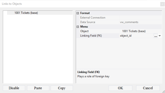 The entry selected in table 1001 Tickets (base) defines records displayed in tables 1102 Status (base) and 1202 Comment (base). For this, links between the tables should be created.
