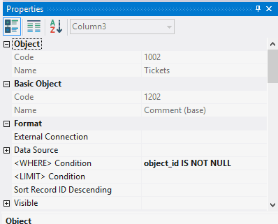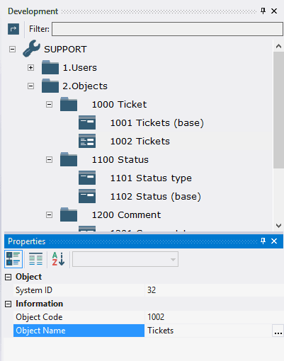 6.2.1.3. In the Properties window, enter 1002 in the Object Code field, enter the Tickets  in the Object Name field.