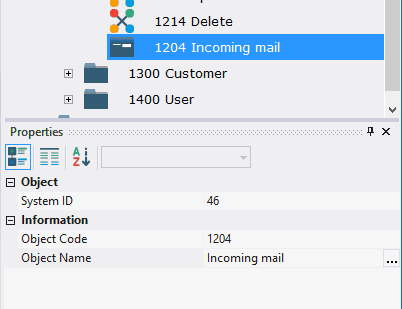 9.2.1.9. In the Properties window, enter 1204 in the Object Code field, enter Incoming mail in the Object Name field.
