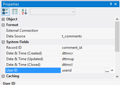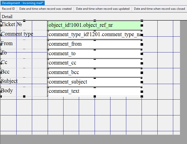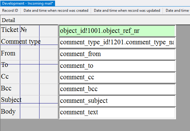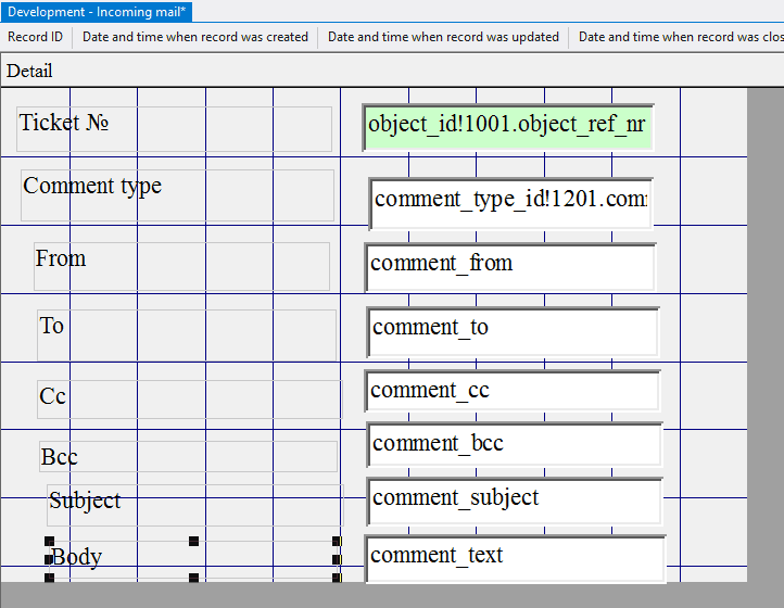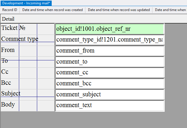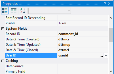 9.2.3.3. In system fields Record ID, Date & Time (Created), Date & Time (Updated), Date & Time (Closed), User ID choose fields from the table - comment_id, dttmcr, dttmup, dttmcl, userid;