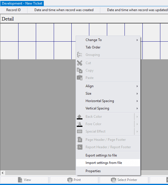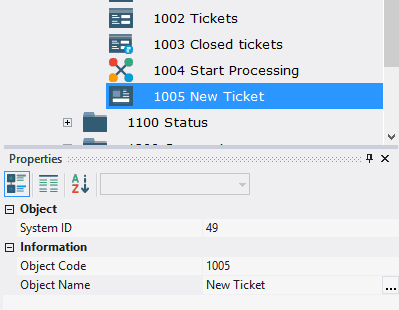 9.5.1.3. In the Properties window, in the Object Code field enter 1005, in the Object Name field enter New Ticket;