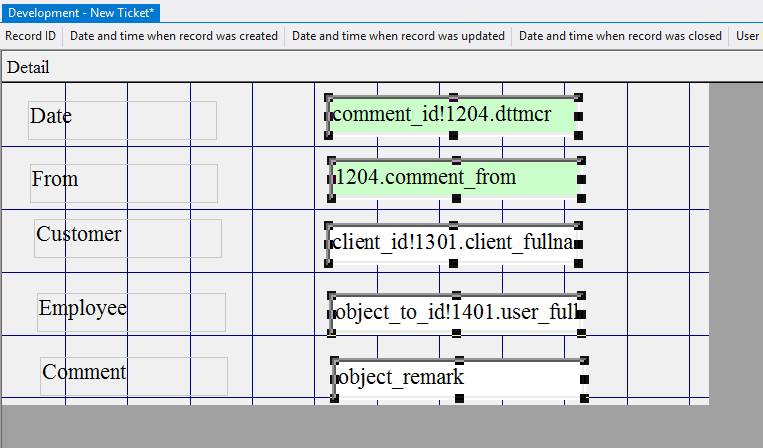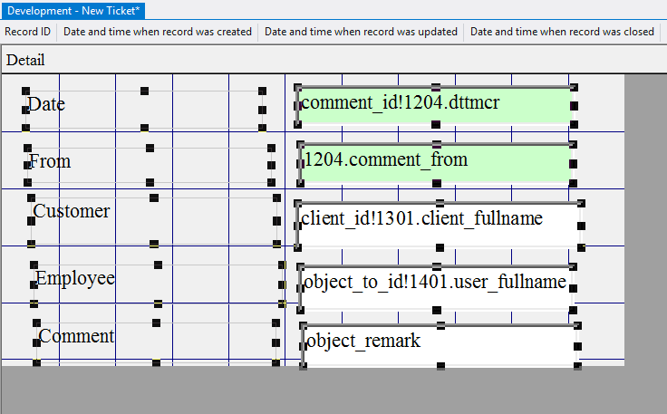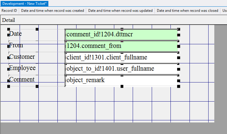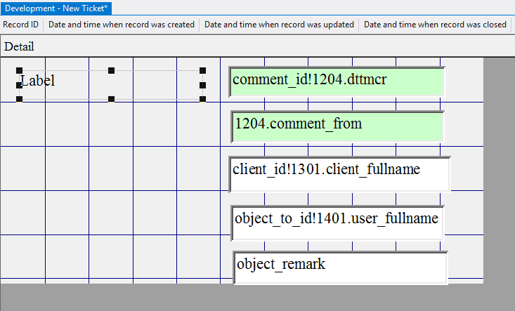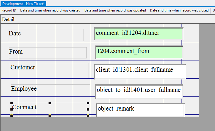 9.5.1.37. In the Caption field of each of the labels enter From, Customer, Employee and Comment, respectively;
