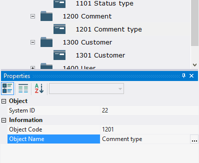 4.4.1.3. In the window Properties in the field Object Code type in 1201, in the field Object Name type in Comment type.