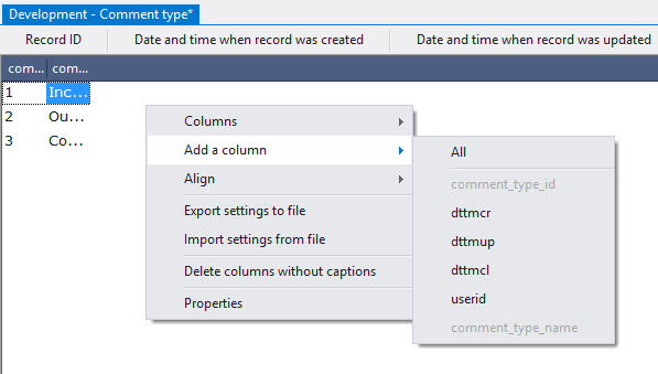 4.4.2.4. Open the context menu by right-clicking in the empty space of the object, choose Add a column and select columns comment_type_id, comment_type_name;