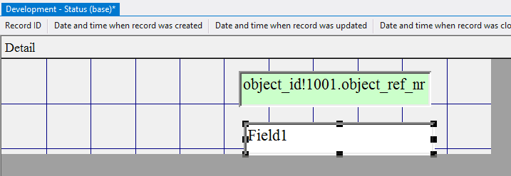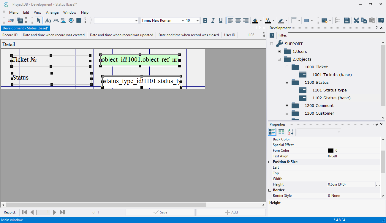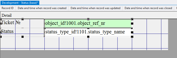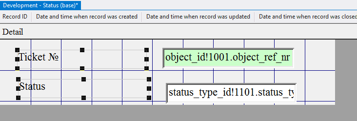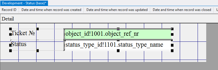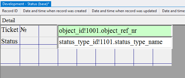 5.3.3.8. In the appeared window type in object_id!1001.object_ref_nr, since this field will refer to the object 1001 Tickets (base) and display the number of the selected ticket when adding the status;