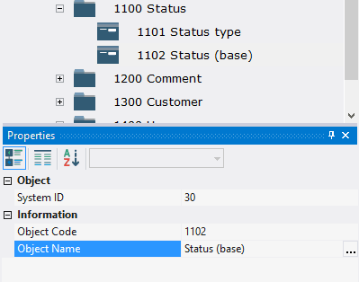 5.3.1.3. In the Properties window, enter 1102 in the Object Code field, enter the Status (base) in the Object Name field.