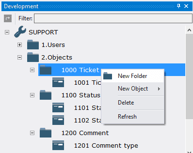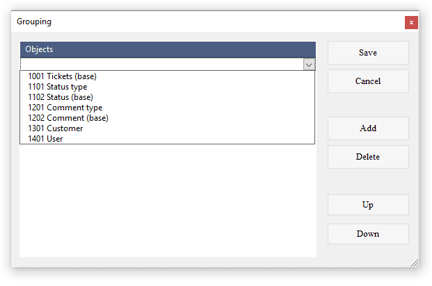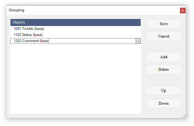 The main object to work with tickets is 1002 Tickets, that consists of the tables 1001 Tickets (base), 1102 Status (base), 1202 Comment (base). Object 1002 Tickets allows you to view not only information about tickets, but also to track the history of changes in statuses and comments.
