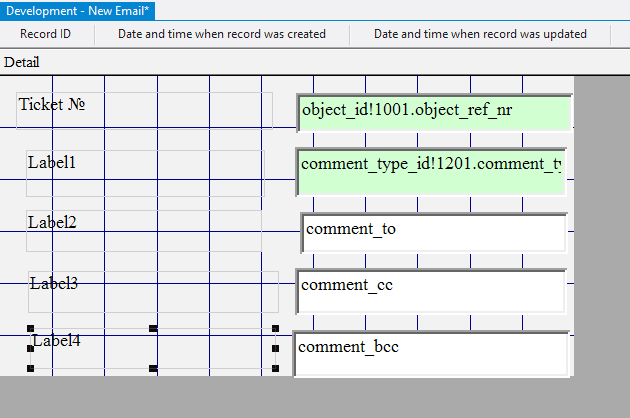 10.2.1.35. In the Caption field of each of the labels enter Comment type, To, Cc, Bcc;