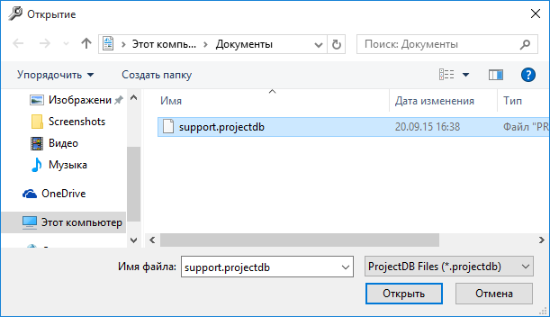 1.8.1.2. в появившемся окне указать путь к файлу с конфигурацией подключения (в данном случае support.projectdb), нажать Открыть;