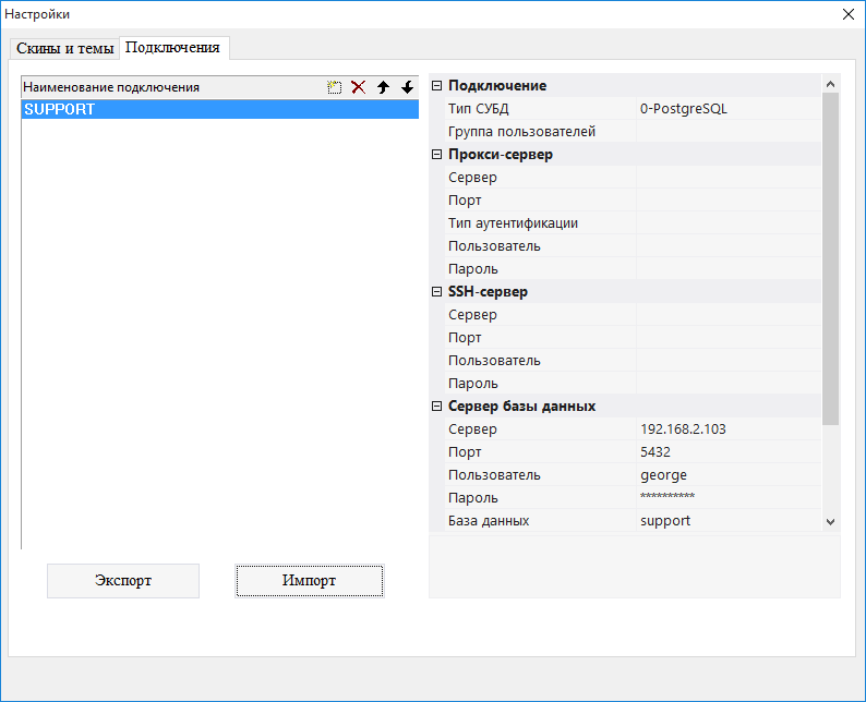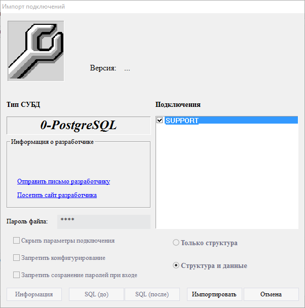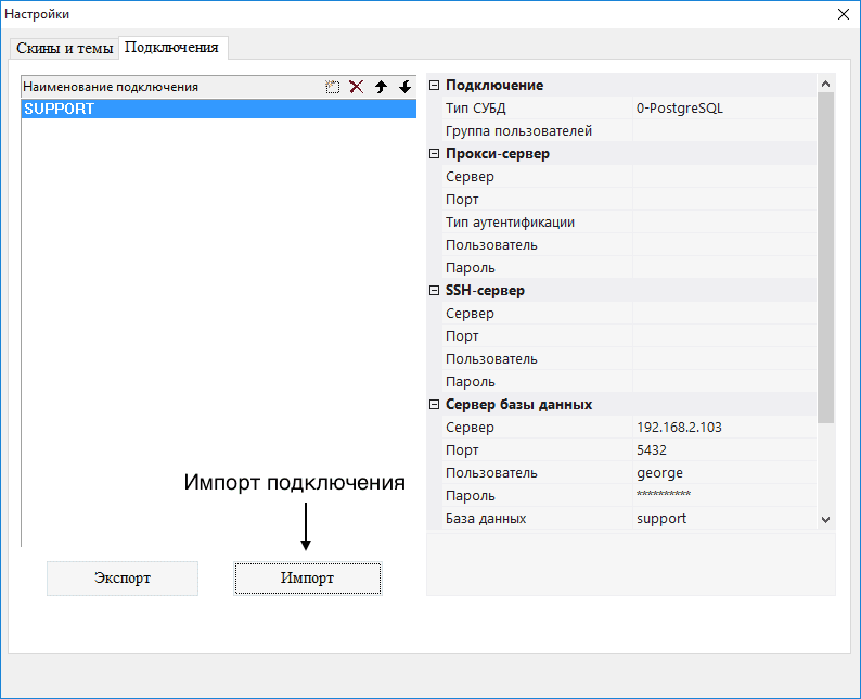 1.8.1.3. в окне Импорт подключений в правой части выбрать требуемые подключения (в данному случае SUPPORT);