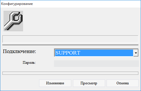 2.2.1.3. в открывшемся окне Конфигурирование в поле Подключение выбрать из выпадающего списка подключение SUPPORT;