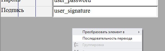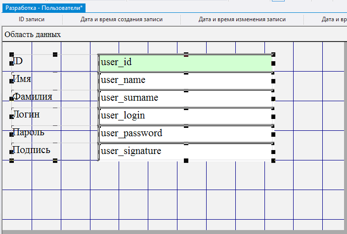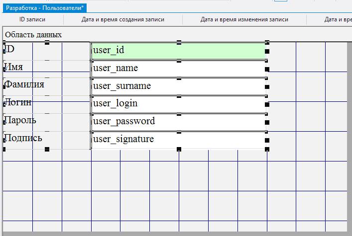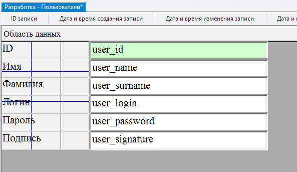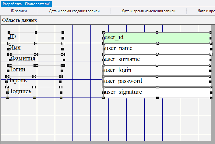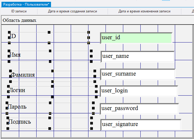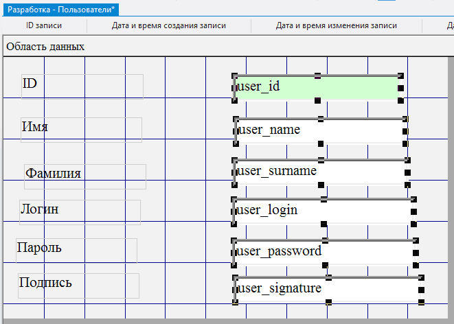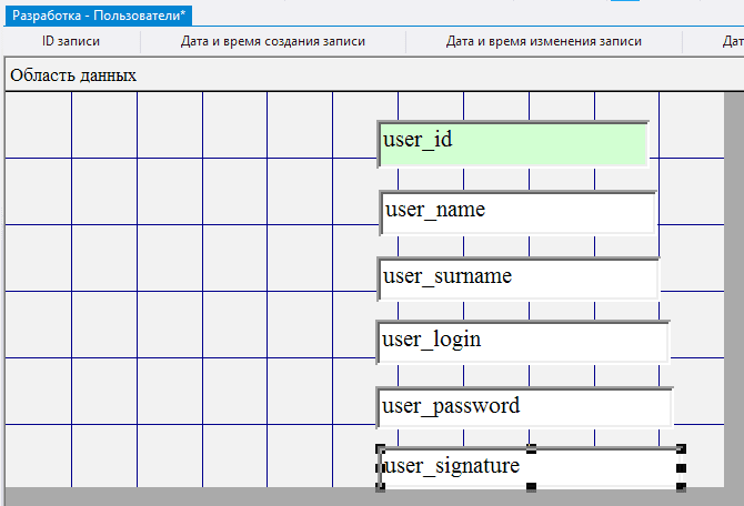 2.5.3.11. в поле Данные для каждого из добавленных полей выбрать соответственно user_name, user_surname, user_login, user_password, user_signature;