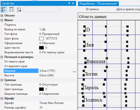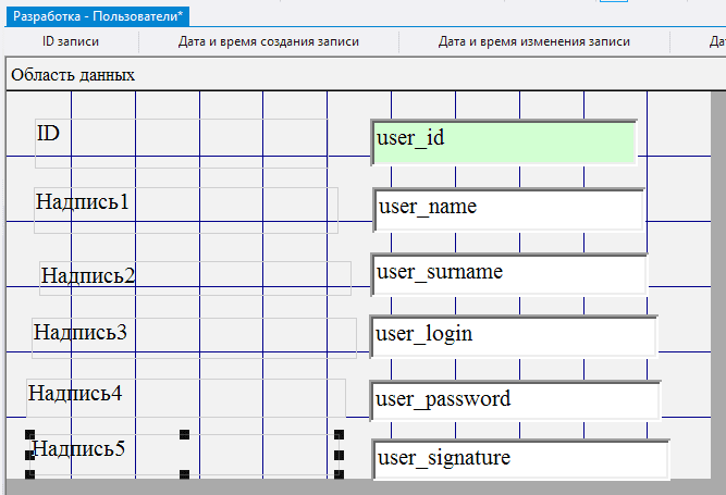 2.5.3.17. в поле Подпись для каждой из добавленных надписей указать соответственно Имя, Фамилия, Логин, Пароль, Подпись;