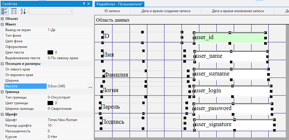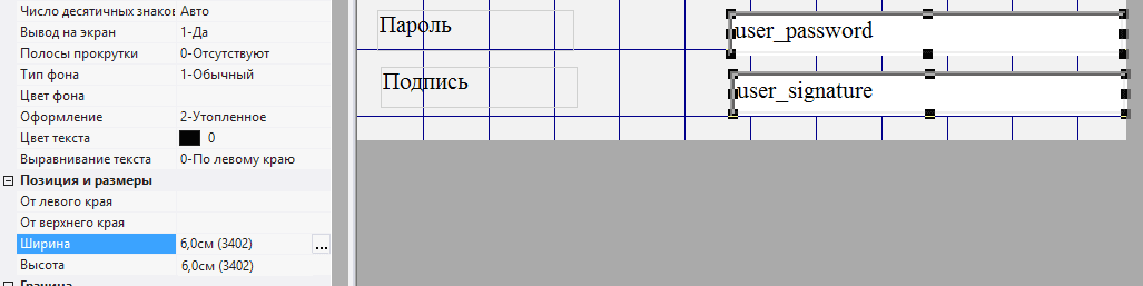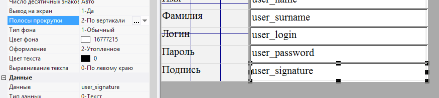 2.5.3.29. выделить поле user_signature - данное поле будет занимать оставшееся свободное место при работе в форме и хранить многострочный текст, поэтому следует разрешить прокрутку текста по вертикали, установив в поле Полосы прокрутки значение 2-По вертикали;