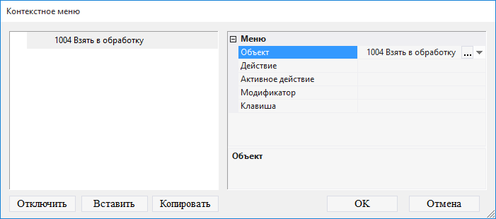 7.5.1.4. в поле Объект выбрать из выпадающего списка действие 1004 Взять в обработку;