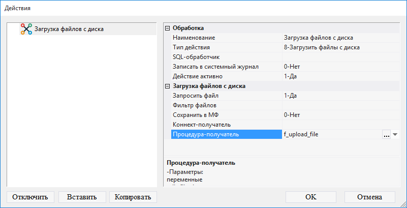 8.5.1.11. в поле Процедура-получатель выбрать функцию f_upload_file;