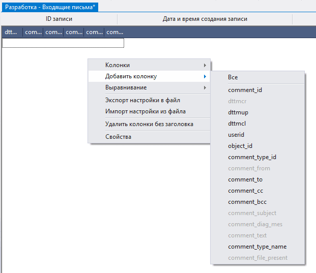 9.2.2.4. вызвать контекстное меню нажатием правой кнопки мыши в пустом пространстве объекта, выбрать Добавить колонку и отметить колонки dttmcr (дата и время создания комментария), comment_from (отправитель письма), comment_subject (тема письма), comment_file_present (наличие вложенного файла), comment_text (текст комментария), comment_diag_mes (диагностическое сообщение, формируемое при анализе темы письма во время загрузки);