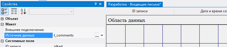 9.2.3.2. в поле Источник данных указать объект базы данных - таблицу t_comments;