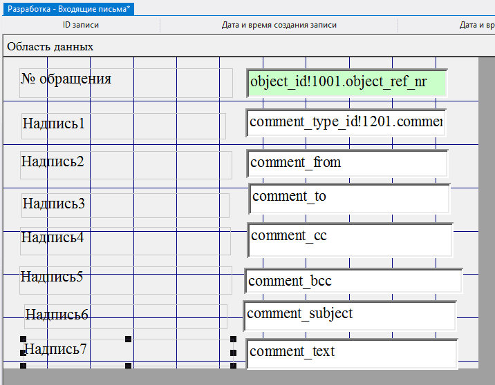 9.2.3.23. в поле Подпись каждой из надписей соответственно ввести Тип комментария, От, Кому, Копия, Скрытая копия, Тема, Текст;